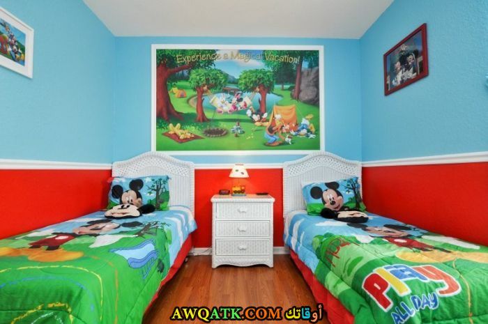مجموعة صور رائعة لغرف نوم أطفال ميكي وميني ماوس للأولاد و البنات على الجدران و السرير والأثاث , الشخصية الكرتونية الشهيرة تتألق في مجموعة تصميمات روعة مودرن في قمة الجمال مبهجة ورائعة و تناسق و تناغم الألوان مع بعضهة بشكل فني مدروس يعطي صورة إجمالية في منتهى الجمال تجعل الولد و البنت يعشقون غرفتهم و يبقون بها أطول فترة ممكنة , إستخدام الشخصيات الكرتونية في غرفة نوم الطفل شيء جميل و ممتع له جداً خصوصاً إذا كان هو من عشاق الشخصية ويتابعها بإستمرار.